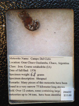 This nice Campo del Cielo Meteorite is a coarse octahedrite 1A meteorite from the famous Argentina fall. This nice specimen weighs 6.8g and measures 1″ long and is displayed in a black Rikers Mount.