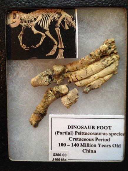This is a number of foot bones in the articulated position from a Psittacosaurus dinosaur from China. They are from the Cretaceous period, 140-100 million years old. The foot measures 3-1/2″ and is displayed in a protective Rikers Mount.