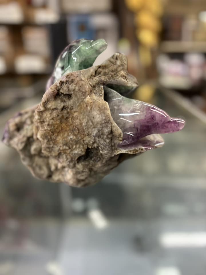 Hand Carved Pair of Dolphins from one piece of multicolor Fluorite. It measures 10.5 in long by 7.5 in high and has beautiful multicolors.