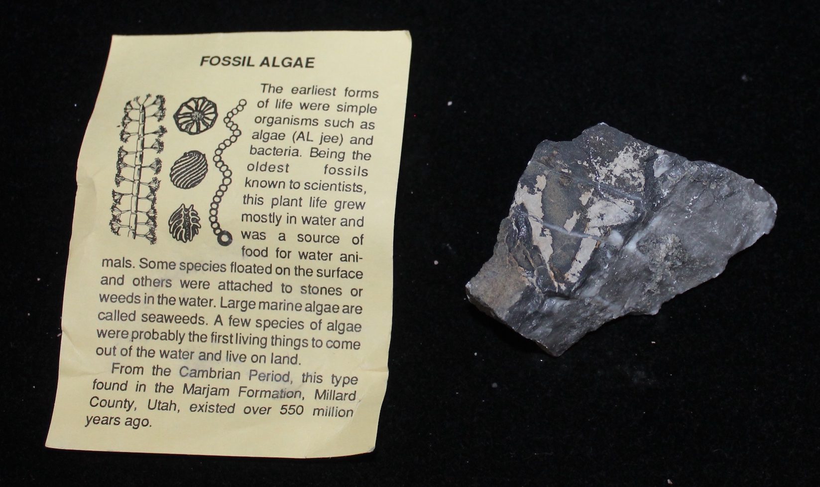 The earliest forms of life were simple organisms such as algae (AL jee) and bacteria. Being the oldest fossils known to scientists, this plant life grew mostly in water and was a source of food for water animals. Some species floated on the surface and others were attached to stones or weeds in the water. Large marine algae are called seaweeds. A few species of algae were probably the first living things to come out of the water and live on land. From the Cambrian Period, this type found in the Marjam Formation, Millard County, Utah, existed over 550 million years ago.