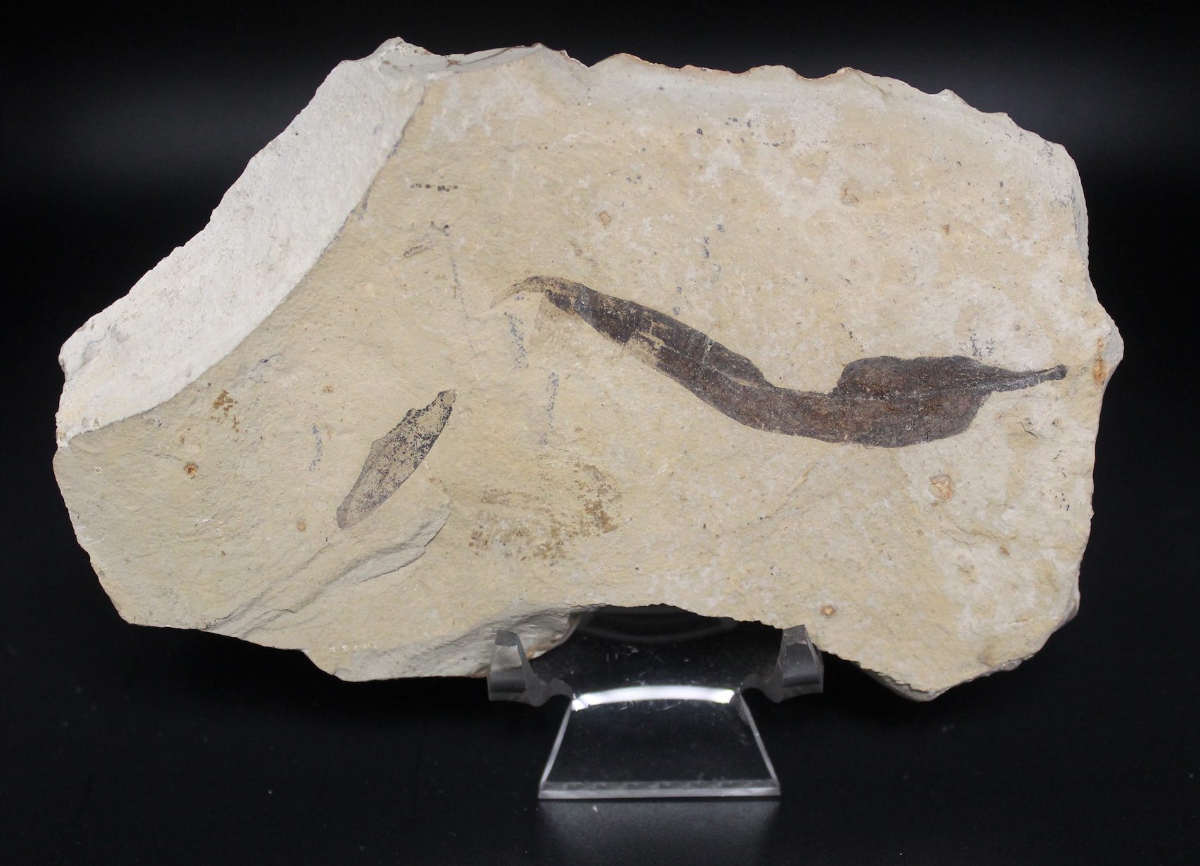 Fossil Leaves The dark leaf measures 70mm x 10mm, with a second leaf measuring 23mm by 6mm on a lighter tan matrix measuring 123 x 80mm. Eocene, 40-50 million years ago. Upper Parachute Creek member of the Green River Formation, Douglas Pass Colorado
