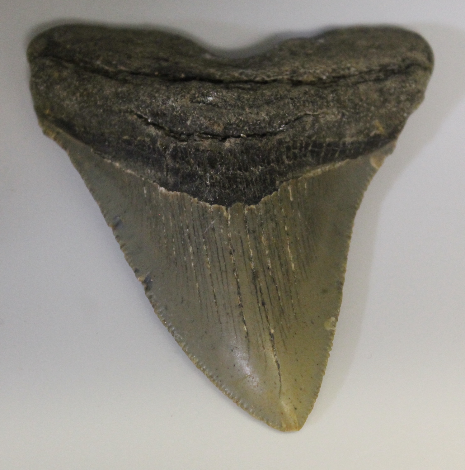 The fossil shark tooth from a Megalodon, found in South Carolina, is from the Miocene period, about 23 to 5.3 million years ago. Megalodon was one of the biggest sharks ever, and its teeth were large, thick, and had sharp edges for biting big prey like whales. These teeth are often found in rivers and near the coast in South Carolina and help us learn about the ocean and sea animals from long ago.