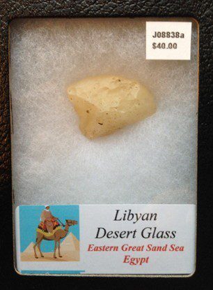Libyan Desert Glass – A nice yellow translucent piece of this fascinating gem material. It was formed about 26 million years ago when a meteorite struck in the Sarara desert between Libya and Egypt. Although some people believe that it is a true meteorite (formed in outer space), it is more generally believed that it originates from sand which was struck by a meteorite and melted, and combines extraterrestrial and terrestrial properties.