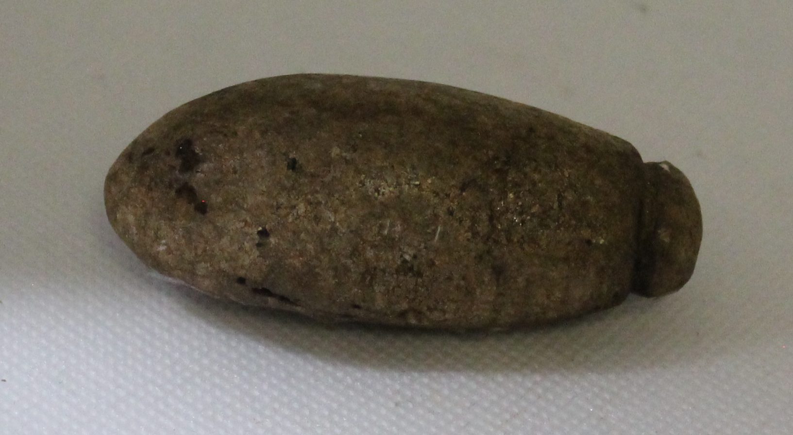 The Plummet or Plumb-Bob, from the Early Woodland period found in Butner, North Carolina, is a type of stone or ceramic object believed to have been used as a weight for fishing nets, or possibly as a tool for creating straight lines in construction or other practical tasks. Typically small, teardrop- or oval-shaped, with a hole or groove at the top for attachment, these items were likely multifunctional in nature. The artifact reflects the technological advancements of the Early Woodland period (circa 1000 BCE to 100 CE), when Native American societies in the Southeast were increasingly engaging in complex subsistence practices, including fishing, hunting, and the development of early agricultural systems. Found in association with other Early Woodland tools and pottery, the Butner plummet provides valuable insight into the daily lives and technological innovations of the region’s prehistoric inhabitants.