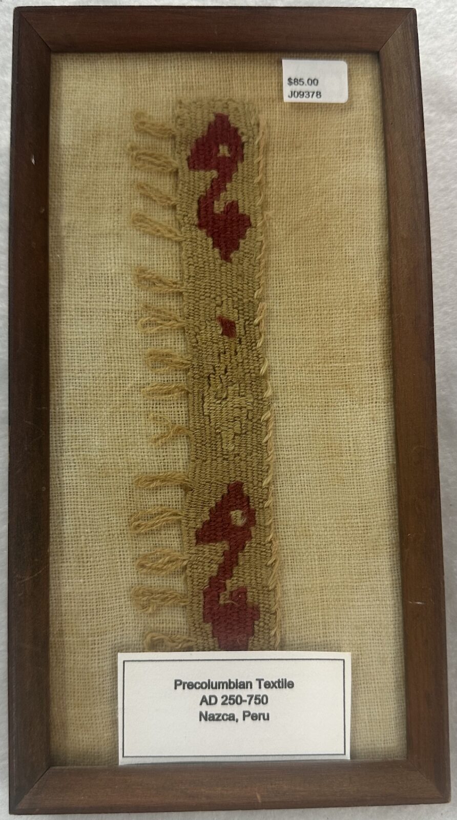 This is a nice Precolumbian Nazca Textile in a frame. The Nazca textile measures 6-1/2 in by 1 in with nice fringe.