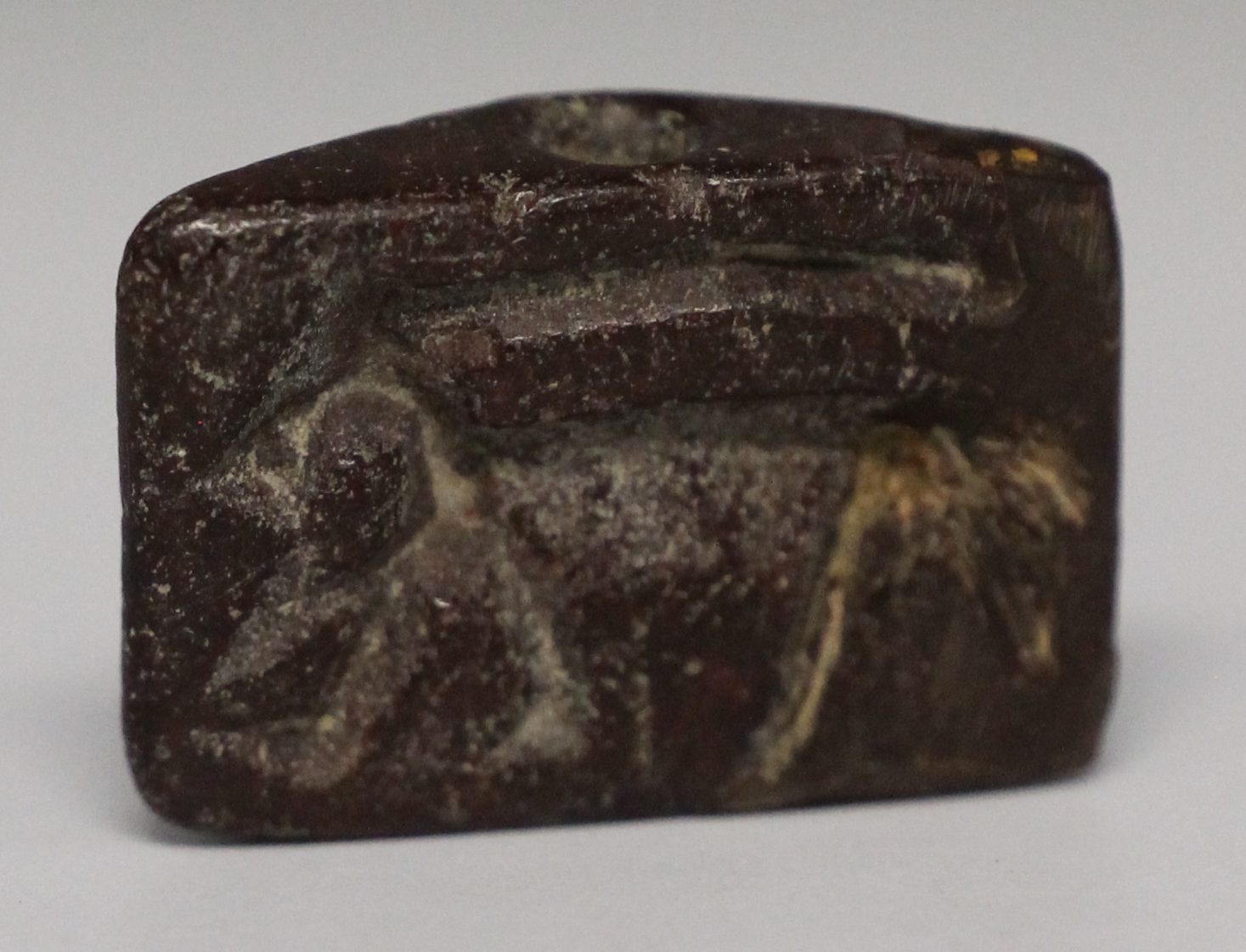 A reddish siliciclastic stone seal from Syria, made between 3000 and 2500 BC, is a small carved object used to stamp designs into clay. People used it to mark ownership or seal goods and documents. The carvings often show symbols, animals, or people, giving clues about early life and beliefs in ancient Syria. These seals are some of the first tools used for communication and show how people expressed identity and art in the ancient world.