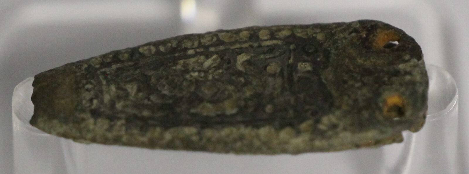 The bronze Anglo-Saxon strap end from the 9th–10th century AD was a small metal fitting attached to the end of a leather strap, commonly used in belts, bags, or horse gear. However, they were also decorative, often made of bronze or other metals and featuring detailed designs. Many times, these included Christian symbols, geometric patterns, or stylized animal figures, reflecting the artistic and religious influences of the Anglo-Saxon Empire.
